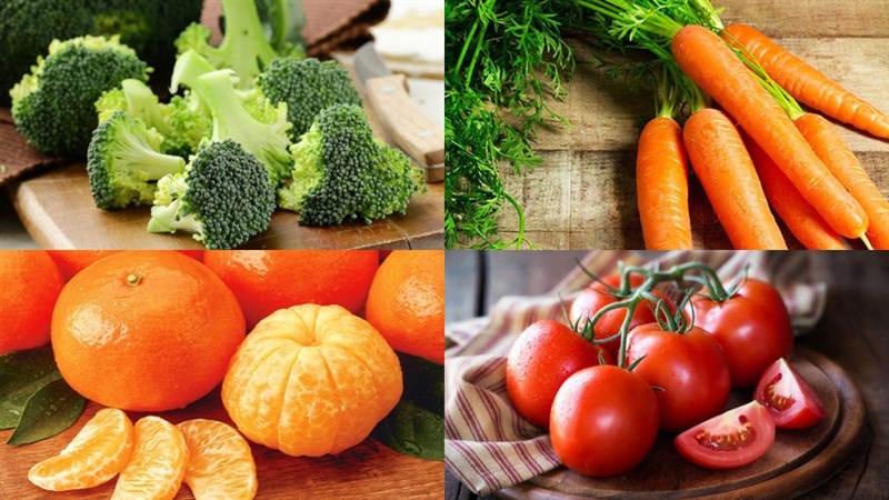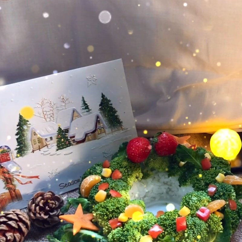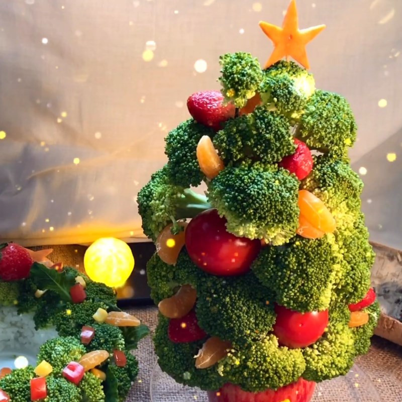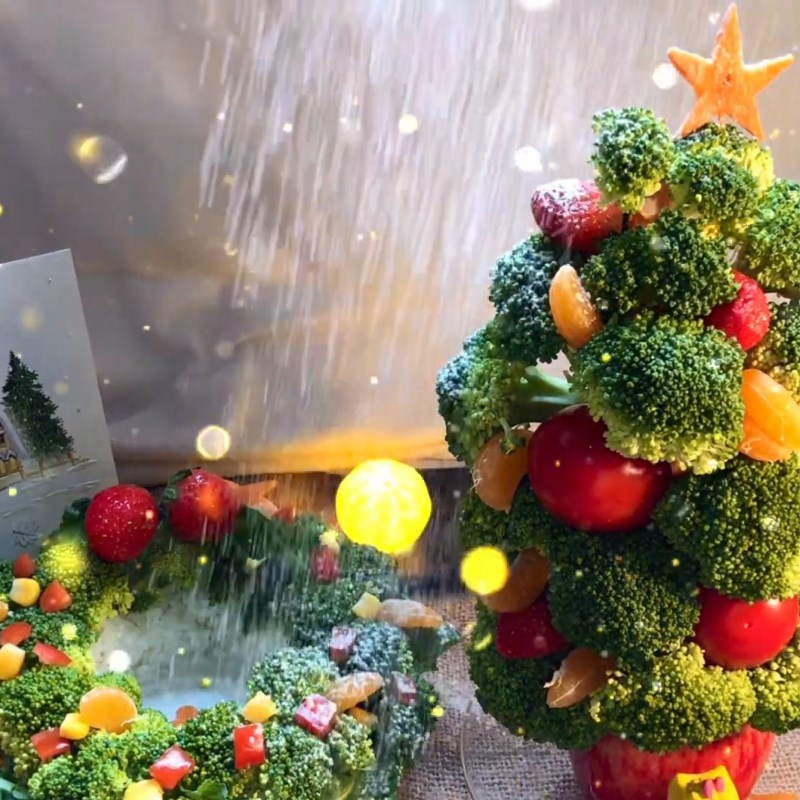 Cây thông Noel và vòng nguyệt quế có màu xanh tươi đẹp mắt của bông súp lơ, thêm một ít màu đỏ của cà chua, dâu tây và ít vàng, cam của quýt hay hạt bắp.