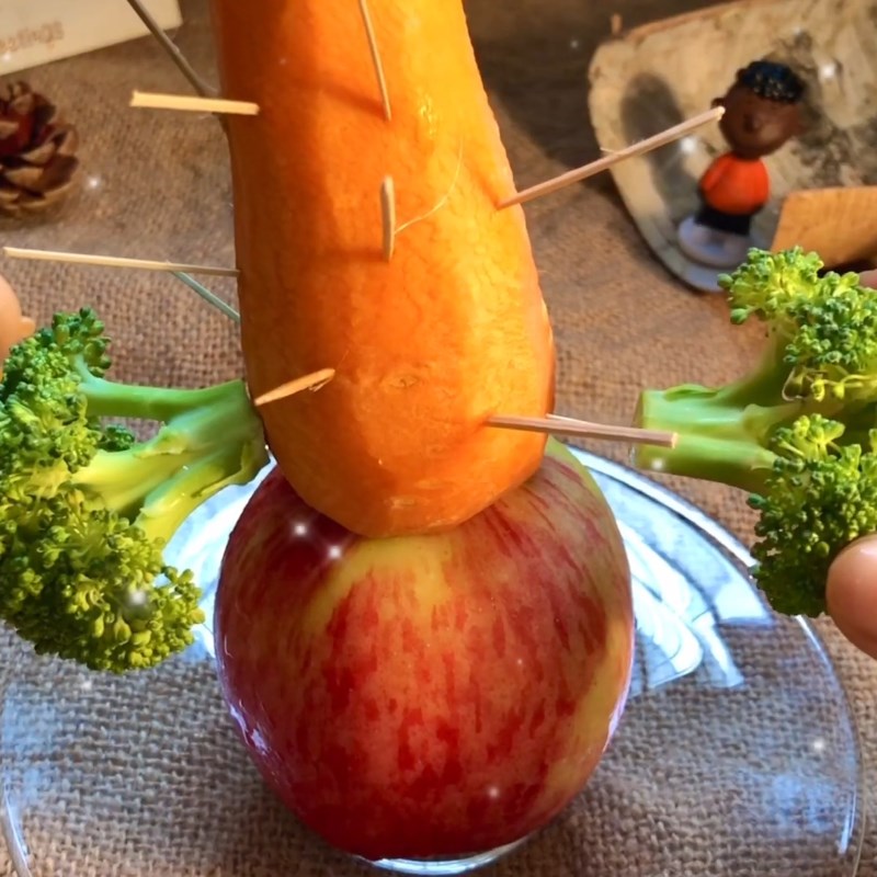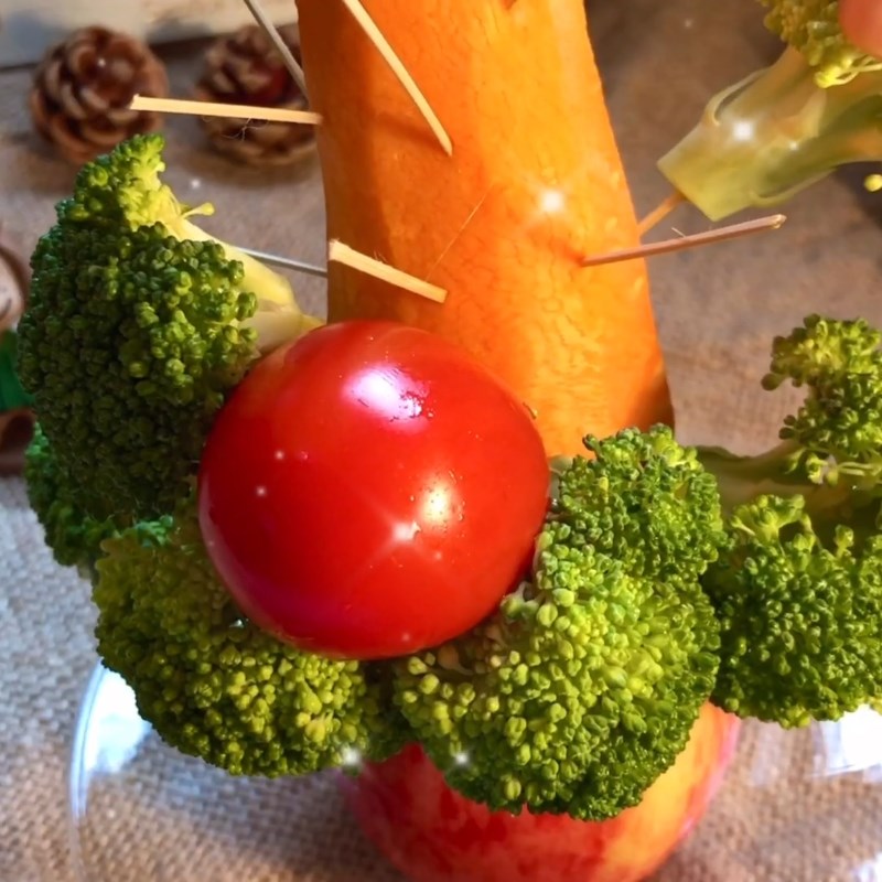 Để tạo hình lá thông, bạn cắm lên thân củ cà rốt vài cây tăm rồi lần lượt ghim từng bông súp lơ xanh vào.