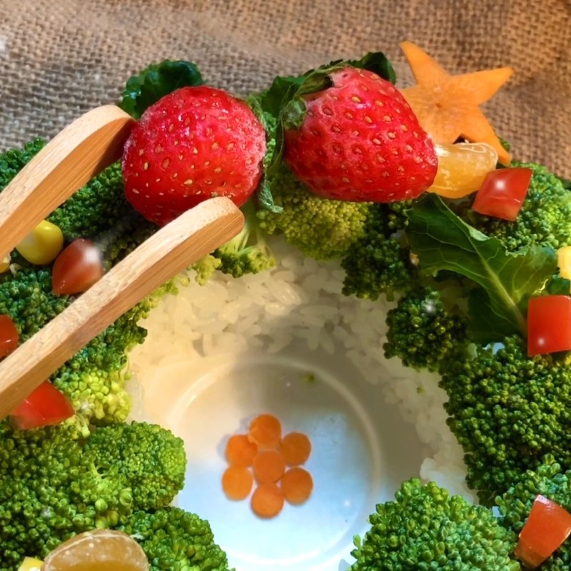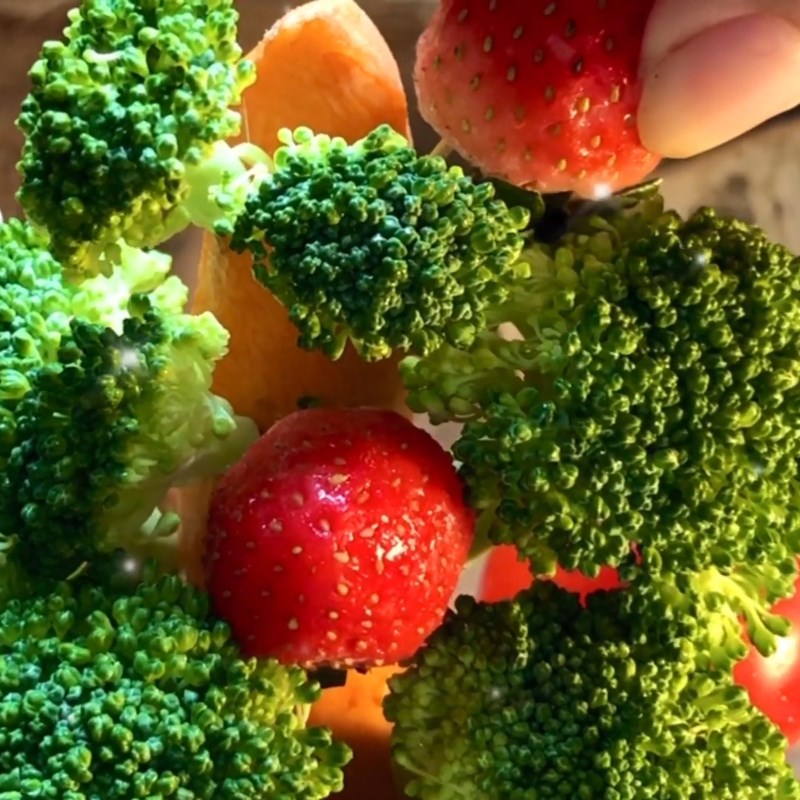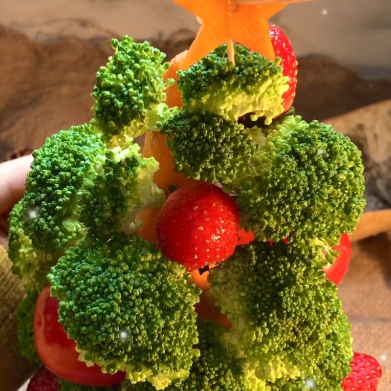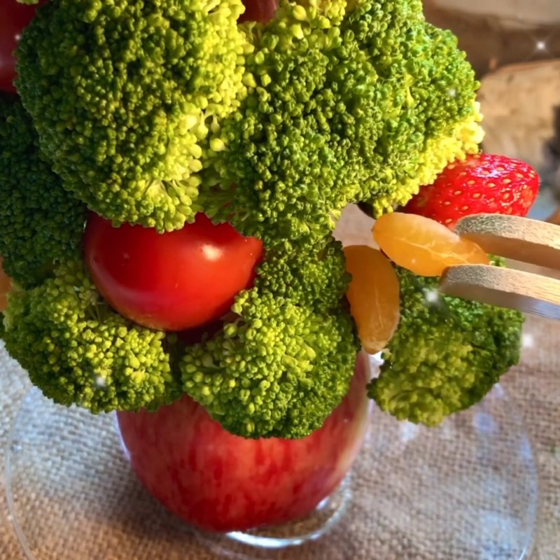 Bạn có thể cắm thêm vài quả cà chua bi và dâu tây xen kẽ với súp lơ xanh để làm quả châu trang trí cho cây thông thêm bắt mắt nhé!
