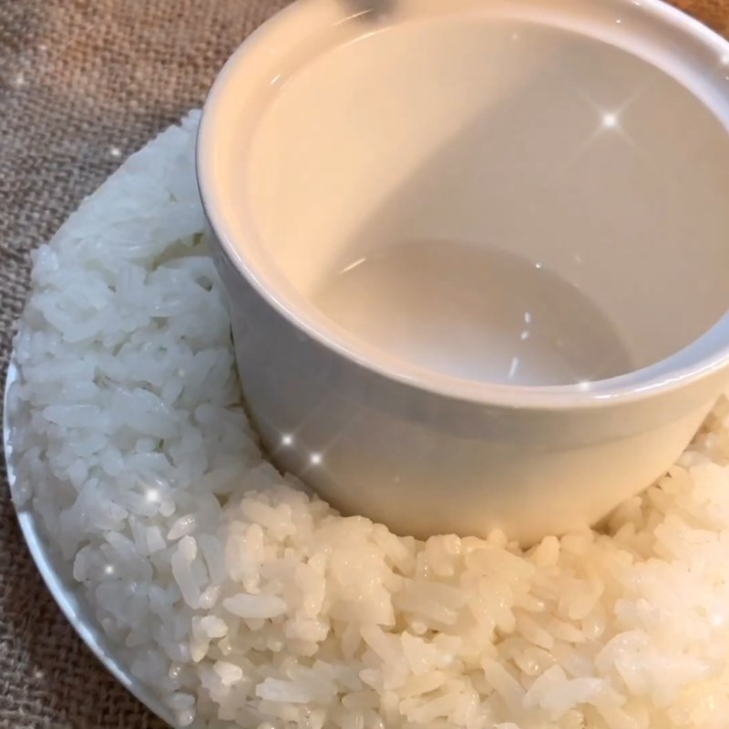 Trước tiên, bạn đặt 1 cái bát vào giữa đĩa rồi dùng thìa đặt cơm xung quanh để tạo hình vòng tròn.